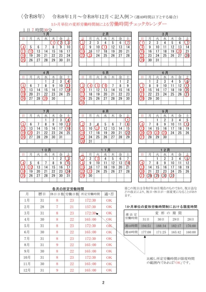 出典:静岡県労働局労働基準部監督課「労働時間チェックカレンダー1か月単位の変形労働時間制・1年単位の変形労働時間制令和8年・令和8年度版」